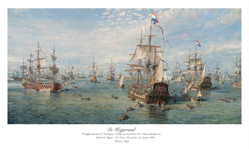 Met zijn schilderij heeft Maarten Platje de uitdaging aangenomen om, als een hommage aan zijn beroemde voorganger, de Krijgsraad te herscheppen en het beeld van De Ruyters vloot in een zo realistisch mogelijke samenstelling en technisch verantwoord weer tot leven te brengen.